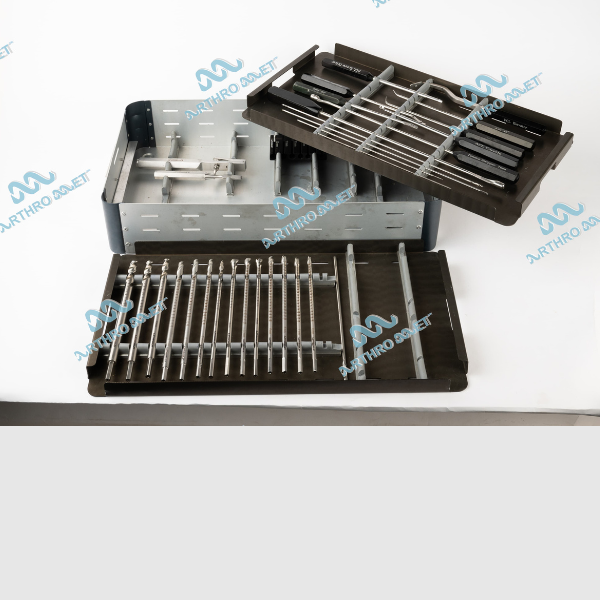 The ACL reconstruction instrument set contains specialized tools used for anterior cruciate ligament (ACL) reconstruction surgery. These instruments help in graft harvesting, tunnel preparation, fixation, and precise placement of the ligament. A standard set usually includes: